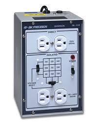 The BK Precision TR-110 is an isolation transformer designed to provide a safe and isolated power source for testing transformerless equipment. It features dual outputs: a direct output and an isolated output with selectable voltage ranges.