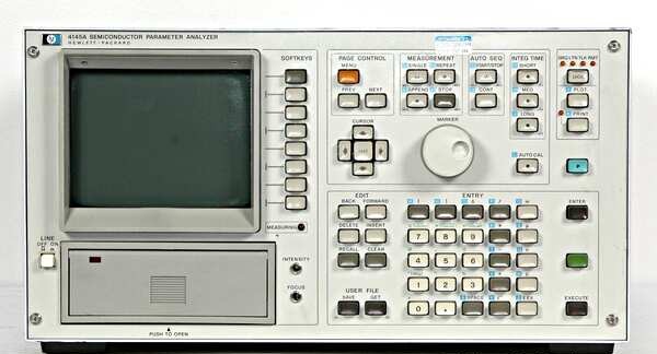 The HP/Agilent 4145A Semiconductor Parameter Analyzer is a programmable DC characterization instrument for measuring and analyzing voltage, current, and resistance parameters across semiconductor devices. It delivers fully automatic stimulus and measurement capability through four configurable SMUs, two programmable voltage sources, and two voltage monitors, enabling precise device evaluation from component-level testing through process control applications.