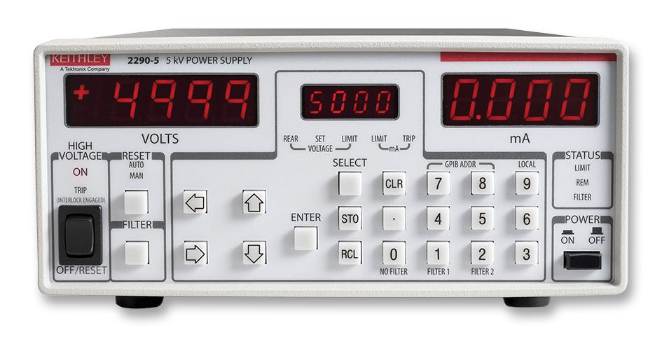 The Keithley 2290E-5 is a single-output 5 kV DC power supply engineered for high-voltage component testing, materials research, insulation validation, and high-energy physics experiments. It delivers precise programmable voltage and current control across a 50 V to 5000 V range with 5 mA maximum output current and 55 W maximum power. The instrument combines low-noise performance—down to 1.0 mVRMS at 1 kV with selectable filtering—with fast transient response and arc/short-circuit protection, making it suitable for applications demanding both accuracy and safety.